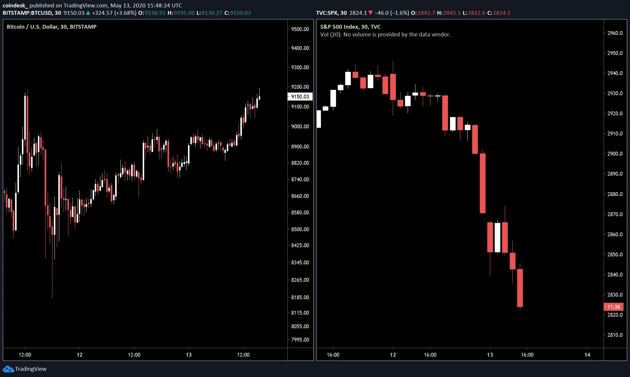 На графике, датируемом началом мая, видно, что биткоин плавно растет в цене, в то время как американский фондовый индекс резко снижается.