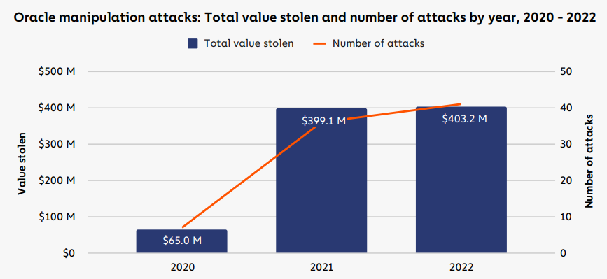 SponsoredСогласно опубликованным данным, за 2022 год хакеры похитили около $403,2 млн в криптовалюте путем манипулирования оракулами. Объемы украденной криптовалюты хоть и незначительно, но растут в годовом масштабе. Например, за 2021 год хакеры похитили за счет схем вокруг оракулов $399,1 млн. При этом еще в 2020 году такие атаки едва ли представляли угрозу всему сектору, поскольку тогда на них приходилось $65 млн. О том, что такое оракулы простыми словами — читайте в специальном материале от редакции BeInCrypto.
