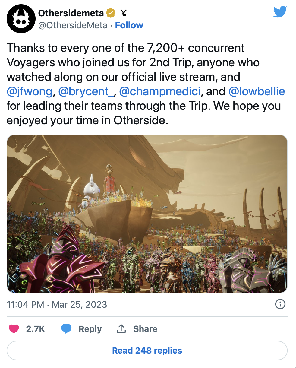 Еще один проект команды ApeCoin – метавселенная Otherside – тоже активно набирает обороты. Недавно команда провела мероприятие Otherside Second Trip, в ходе которого 10 000 держателей NFT Otherdeeds исследовали виртуальные земли.