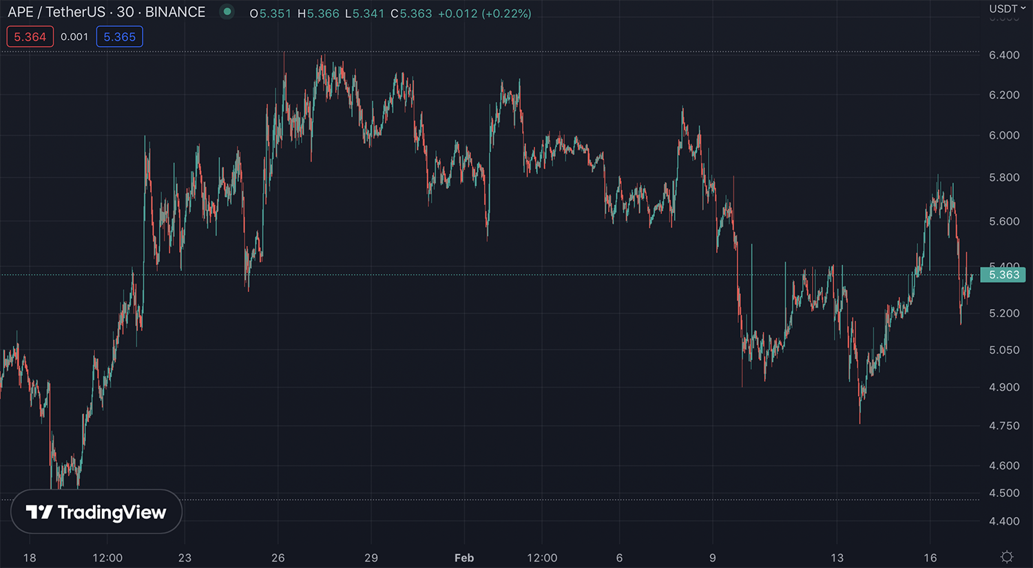 Цена APE упала с внутридневного максимума в $5,70 до минимума в $5,15 несколько часов назад, уничтожив все достижения последних дней. На момент публикации актив торгуется на отметке $5,36.