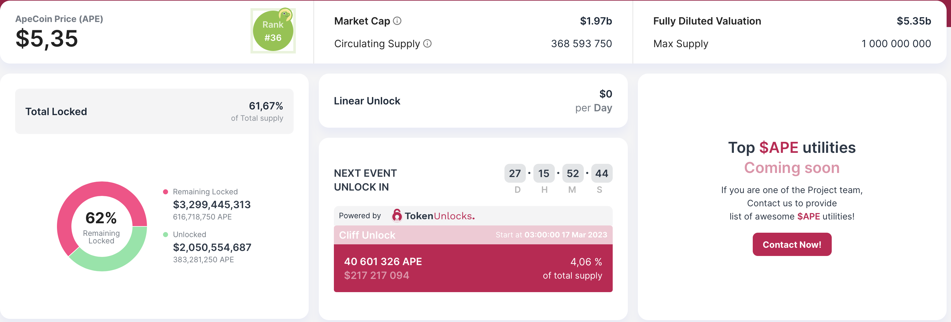 Следующая разблокировка токенов ApeCoin намечена на 17 марта. В этот день на рынок попадет еще 40,6 млн APE, или 4% от общего объема предложения. Вероятнее всего, такой крупный разлок окажет гораздо большее влияние на цену актива.