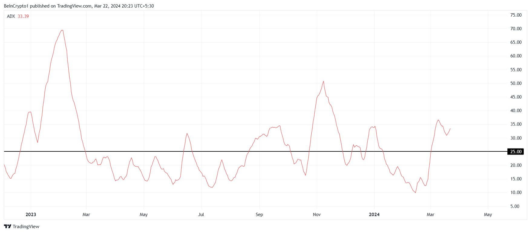 Первым признаком потенциального продолжения ралли является индекс средней направленности (ADX). Этот индикатор измеряет силу тренда, давая представление о направлении движения цены. Значения выше порога 25,0 говорят о том, что текущий тренд достаточно силен.