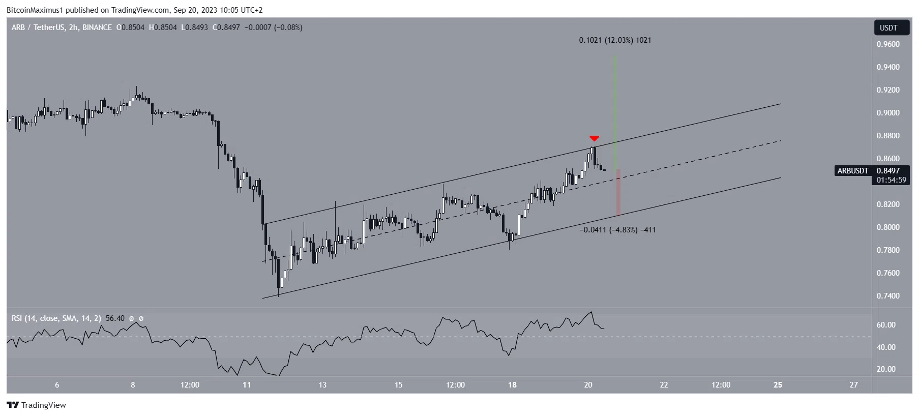 Технический анализ краткосрочного двухчасового таймфрейма дает неоднозначные результаты. Ценовое действие показывает, что текущий отскок Arbitrum ограничен пределами восходящего параллельного канала. 20 сентября ARB достиг линии сопротивления и немного снизился, однако по-прежнему торгуется в верхней части фигуры.