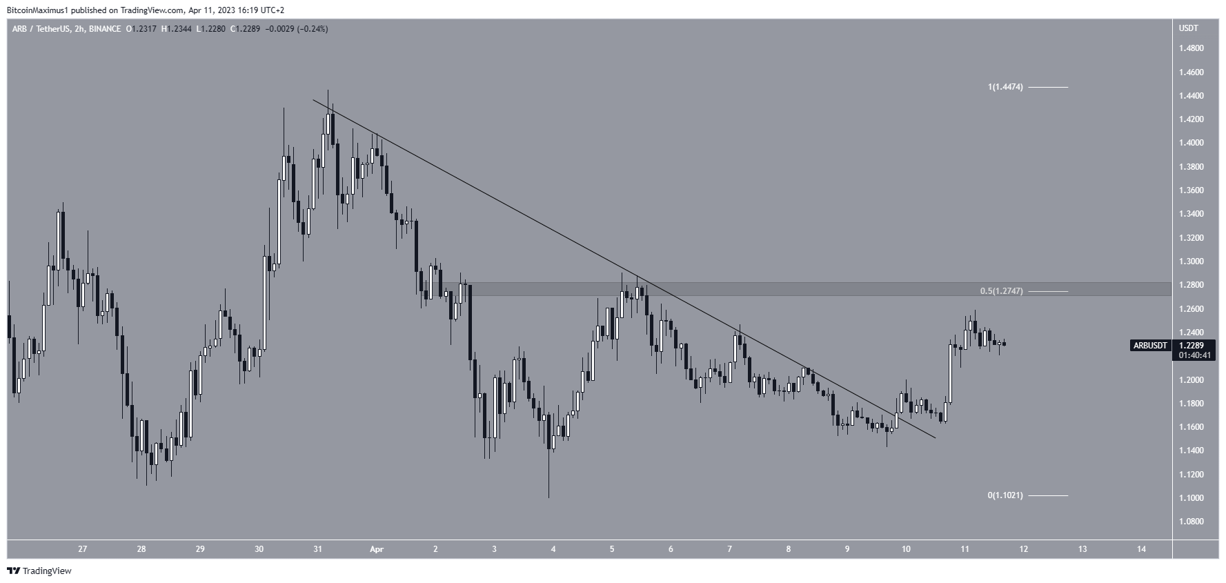 В настоящее время цена ARB приближается к области сопротивления $1,27, образованной уровнем 0,5 Фибоначчи и горизонтальной линией. Если активу удастся ее преодолеть, тренд однозначно будет считаться бычьим. В ином случае возможно падение до уровня поддержки $1,15.