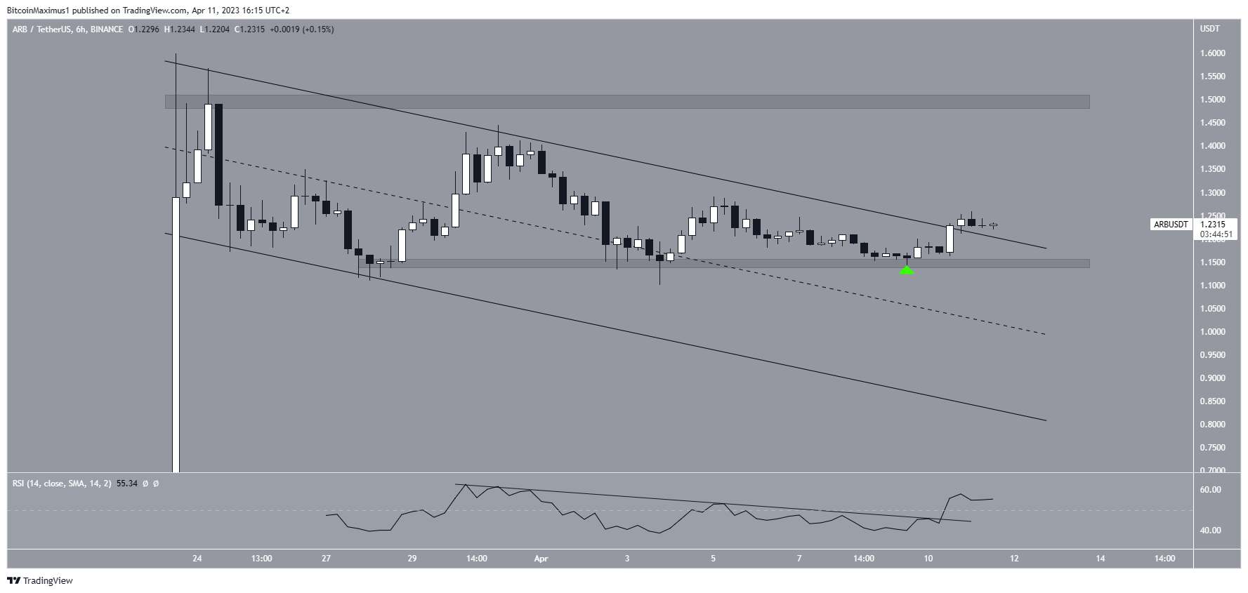 После отскока в область поддержки $1,15 и формирования более высокого минимума (на графике он отмечен зеленым значком) 9 апреля ARB начал восходящее движение. Сейчас актив находится в процессе выхода из канала. Одновременно с этим RSI отбился от нисходящей линии сопротивления и закрепился выше 50.