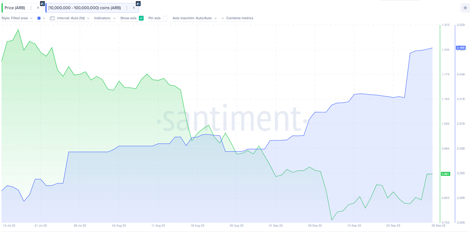 11 сентября цена Arbitrum просела до исторического минимума в $0,75. Однако группа китов с балансами от 10 до 100 млн токенов активно откупила падение, добавив к своим запасам еще 140 млн ARB.