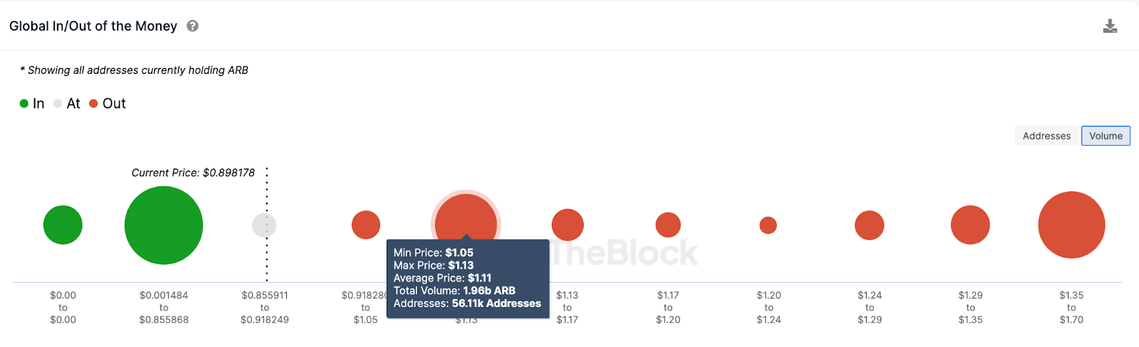 Данные Global In/Out of Money Around Price (GIOM), отражающие распределение цен входа в позиции текущих держателей ARB, подтверждают этот тезис. Однако чтобы закрепить результаты, быкам придется преодолеть сопротивление из 56 110 адресов, которые приобрели 1,96 млрд токенов по минимальной цене $1,05.