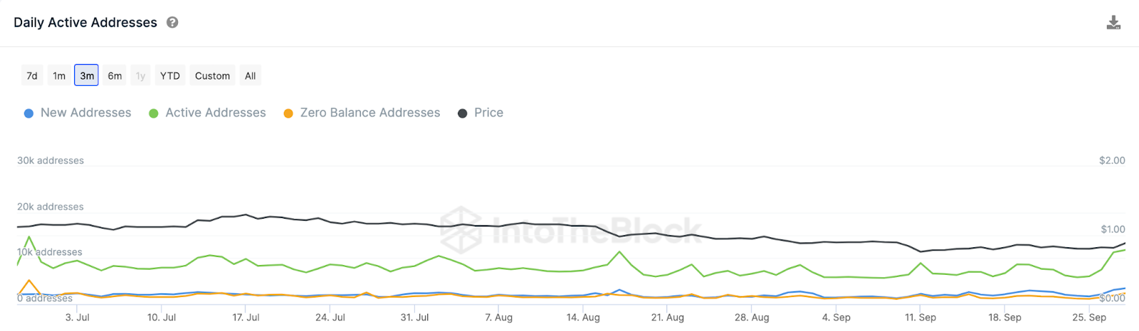 Метрика Daily Active Addresses суммирует количество уникальных адресов, осуществляющих транзакции. В последний раз показатель достигал этого уровня три месяца назад.