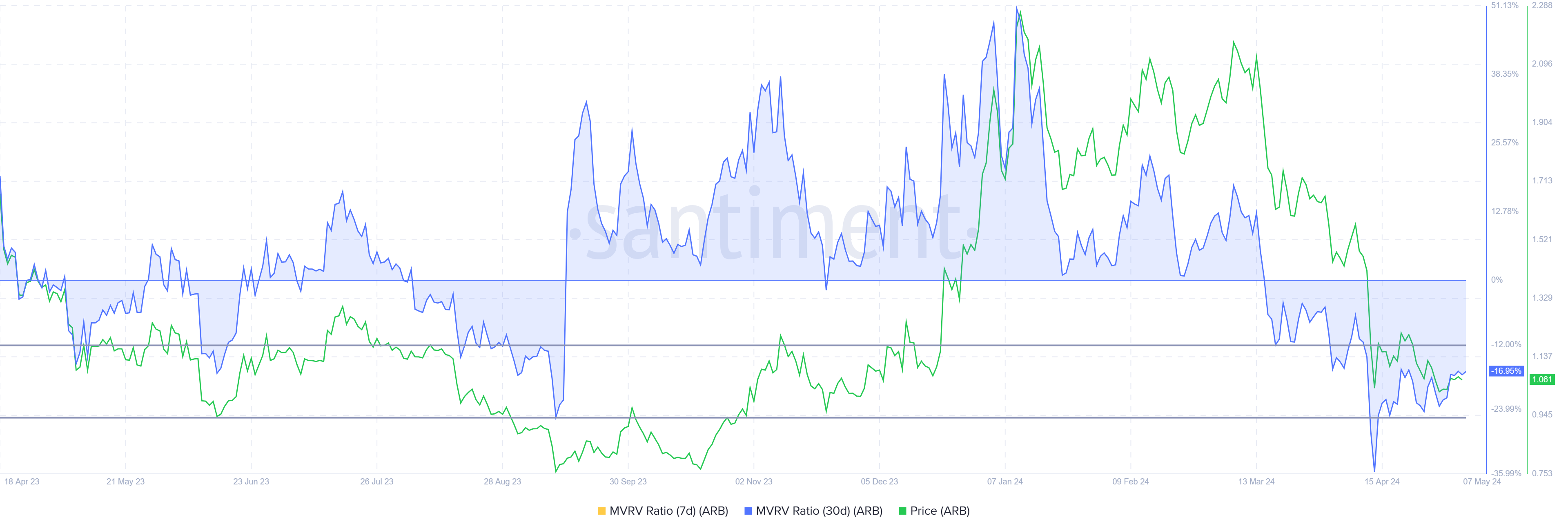 30-дневный MVRV Arbitrum в настоящее время находится на уровне -17%. Исторически восстановление цены актива происходило в диапазоне MVRV от -12% до -25%, что указывает на оптимальную возможность для накопления. Если держатели ARB перейдут к накоплению, они смогут извлечь максимальную выгоду из потенциального ралли.