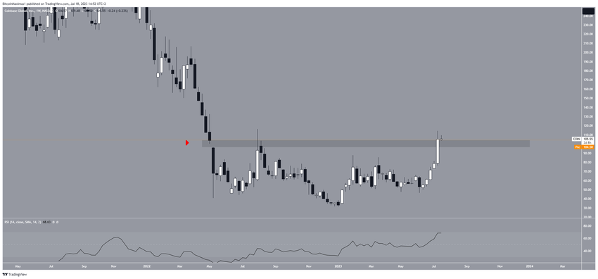 По итогам прошлой недели акции Coinbase (COIN) зарегистрировали самое высокое с апреля 2022 года недельное закрытие. Оно также произошло выше горизонтальной зоны сопротивления $100