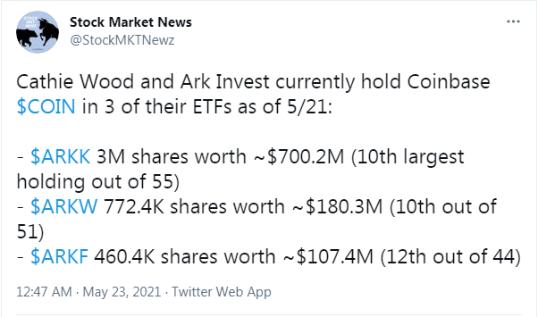 Акции Coinbase упали на 31,7% с момента запуска в прошлом месяце. В пятницу, 21 мая, стоимость ценных бумаг снизилась еще на 3,88% до $224,35, что было обусловлено общим падением рынка криптовалют. Таким образом, на момент написания материала Ark Investment Management владеет акциями Coinbase практически на $1 млрд. Ценные бумаги криптобиржи размещаются в трех ETF в следующих объемах: