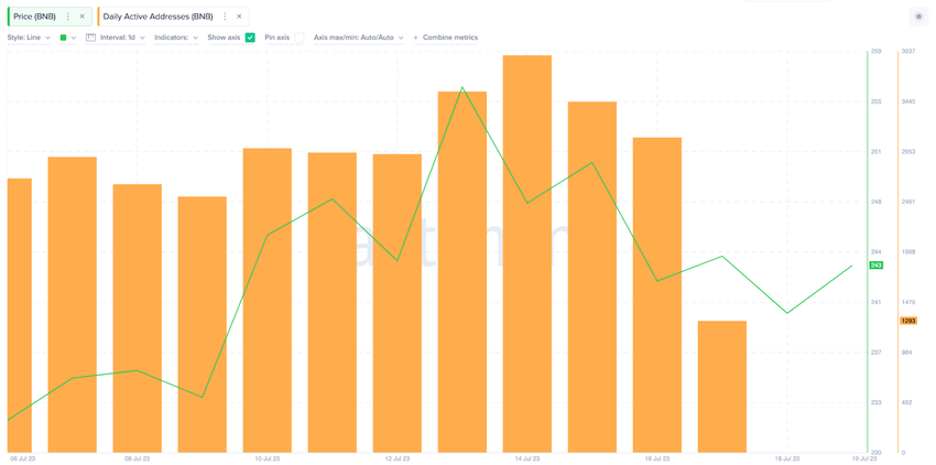 Однако теперь график показывает, что после того, как ажиотаж вокруг события публичной продажи улегся, сеть BNB снова начала терять популярность. С момента достижения недавнего максимума 14 июля показатель активных адресов BNB упал на 200% и составил 1293 на момент закрытия торгов 17 июля.