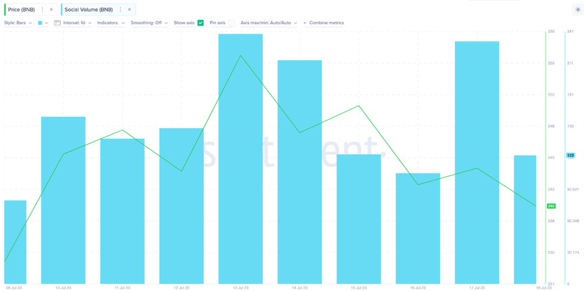 Помимо резких колебаний в сети BNB, запуск токена Arkham вызвал значительный резонанс на различных социальных платформах и в СМИ. Данные Santiment показывают, что за последнюю неделю показатель социальных объемов (Social Volume) BNB увеличился. За период с 9 по 17 июля он вырос на 190%, с 80 до 232 упоминаний.