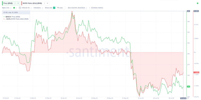Коэффициент Market-Value to Realized-Value (MVRV) от Santiment, демонстрирующий соотношение рыночной и реализованной стоимости монеты, показывает, что большинство держателей, купивших BNB за последние 60 дней, в настоящее время находятся в зоне 10%-ных убытков. Если активность в сети продолжит снижаться, медведи могут направиться к целевому уровню $210.