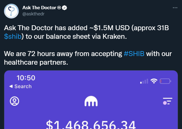 Канадский фармацевтический сайт Ask The Doctor распродал все свои инвестиции в SHIB в размере 31 млрд SHIB (~$1 млн). Об этом сообщается в твиттере компании. Впервые она купила десятки миллиардов SHIB на сумму в $1,5 млн в начале декабря. Посредником покупки выступила биржа Kraken.