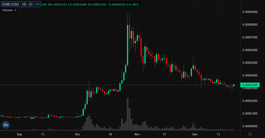 На фоне новостей цена SHIB в паре SHIB/USD обвалилась до октябрьских значений на уровне $0,00002764. Впрочем, на фоне всеобщего роста рынка альткоин быстро отыграл падение и уже стоит $0,00003260, по данным Nomics. Начиная с конца октября альткоина находится, преимущественно, в нисходящем тренде.