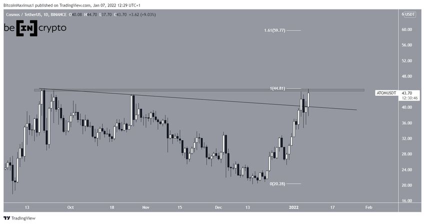 Так, коин ATOM совершил 4 января бычий пробой линии нисходящего сопротивления. За этим прорывом последовало небольшое снижение, но затем цена возобновила рост и сейчас пытается прорвать область сопротивления $44.5. Это последняя преграда на пути рынка к историческому максимуму.