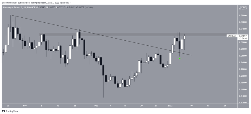 Как и в случае с ATOM, курс ONE совершил 2 января бычий пробой линии нисходящего сопротивления. После этого рынок вернулся сюда спустя два дня, чтобы протестировать этот уровень в качестве поддержки (зеленый значок), а затем возобновил рост.