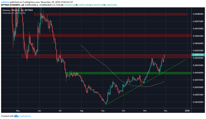 Курс ATOM отметил 5 сентября минимум на 18,000 сатоши и с тех пор двигался вдоль линии восходящей поддержки.