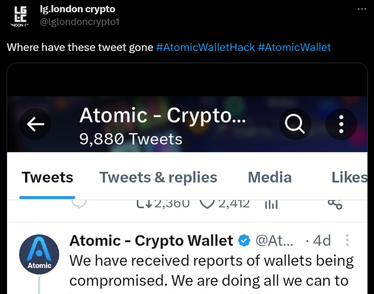 Криптовалютный кошелек Atomic Wallet удалил твиты, в которых заявил, что по итогам взлома пострадали менее 1% от всех пользователей кошелька