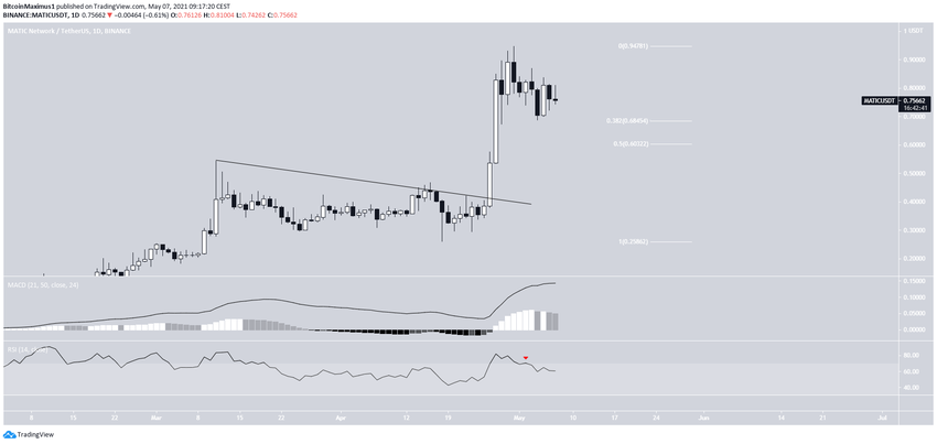 MATIC совершил прорыв и начал параболически расти 26 апреля и достиг исторического максимума 30 апреля на уровне $0,947. Падение продолжалось до тех пор, пока цена не достигла поддержки $0.685 (0,382 коррекции Фибоначчи).