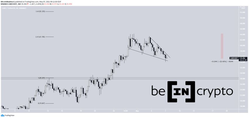 CAKE снижается с 30 апреля после достижения максимума на уровне $44,77. Вершина сформировалась вблизи 2,61 коррекции Фибоначчи относительно предыдущего снижения. Токен потерял с тех пор уже 20%.