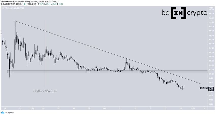 Курс ICP достиг 20 мая максимума на $224 и с тех пор снижался. При этом цена двигалась вдоль линии нисходящего сопротивления.
