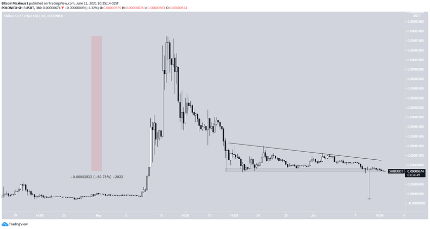 Последующий отскок был слабым, и цена сформировала четыре понижающихся максимума. С учетом области горизонтальной поддержки $0.00000680, SHIB сформировал на графике паттерн «нисходящий треугольник».