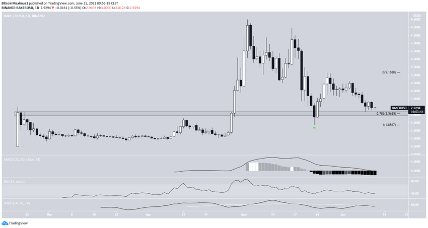 Курс BAKE сформировал 2 мая исторический максимум на $8.49 и развернулся на юг. 16 мая на графике появился понижающийся максимум, после чего рынок снова запустил фазу резкой просадки.