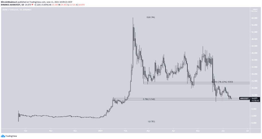 После фазы продолжительного снижения курс AVAX отскочил 23 мая от области поддержки $13.53. Впрочем, рынку не удалось достичь области сопротивления $23. Цена сформировала понижающийся максимум и снижалась со 2 июня.