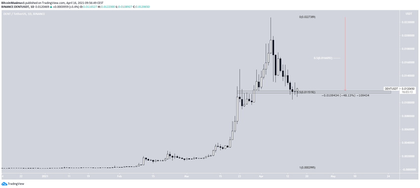 DENT достиг максимума 5 апреля в области $0,0227, и с тех пор цена снижается. За это время токен потерял 48% стоимости.