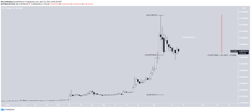 BTT достиг максимума 5 апреля на уровне $0.0134 и начал снижение. Относительно максимума цена потеряла 42%.