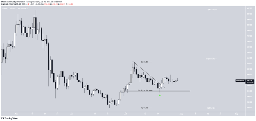 COMP движется вдоль нисходящей линии сопротивления с 6 июля. К 20 июля монета спустилась к отметке $310.
