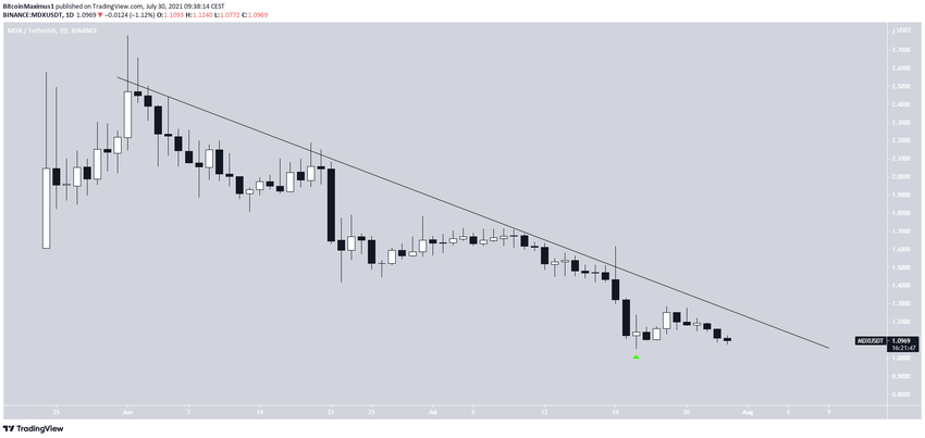 MDX движется вдоль нисходящей линии сопротивления с 1 июня. Затем, 21 июля, токен упал к историческим минимумам на уровне $1,05.