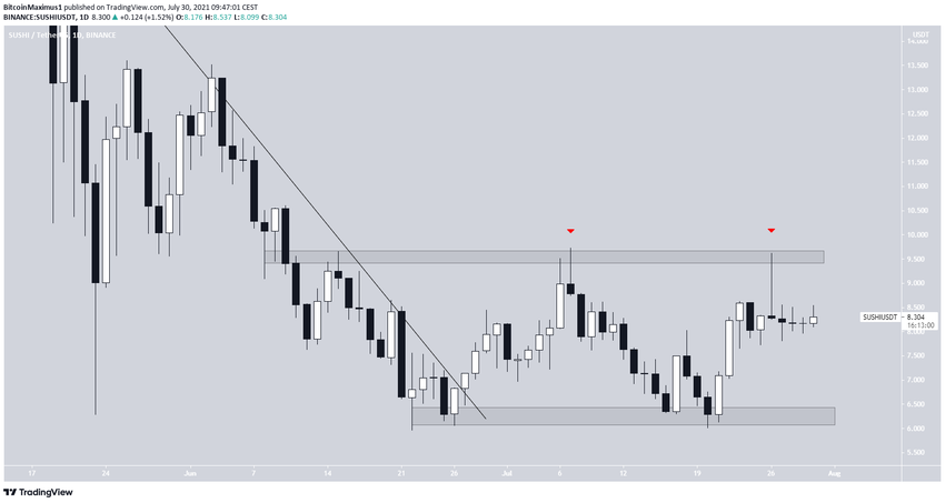 Сейчас SUSHI торгуется в середине диапазона $6,25-$9,60.