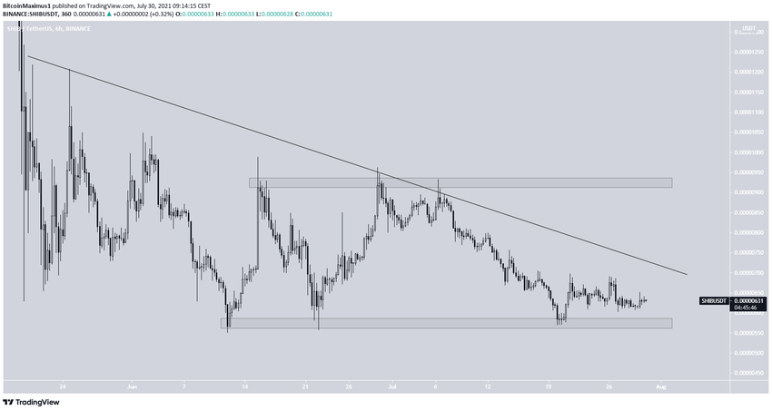 SHIB не сумел преодолеть упомянутое нисходящее сопротивление. Последний раз цена тестировала этот уровень 6 июля.