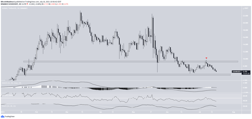 Цена на SUSHI достигла минимума 22 июня на уровне $5,96 и резко скорректировалась. К 7 июля монета достигла $9,72. Однако закрепиться выше горизонтального сопротивления $9,30 так и не удалось.