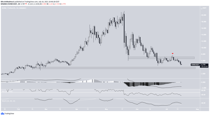 Однако с тех пор токен движется вдоль нисходящей линии сопротивления. К 14 июля он вернулся в область поддержки $0,69.