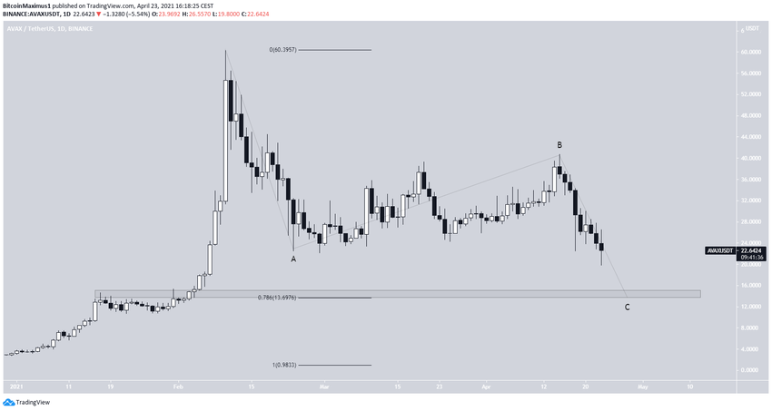 AVAX, как и CRO, похоже, завершает корректирующую структуру ABC, которая приведет его к области $13,70. Она совпадает с уровнем коррекции Фибоначчи 0.786 относительно всего восходящего движения.