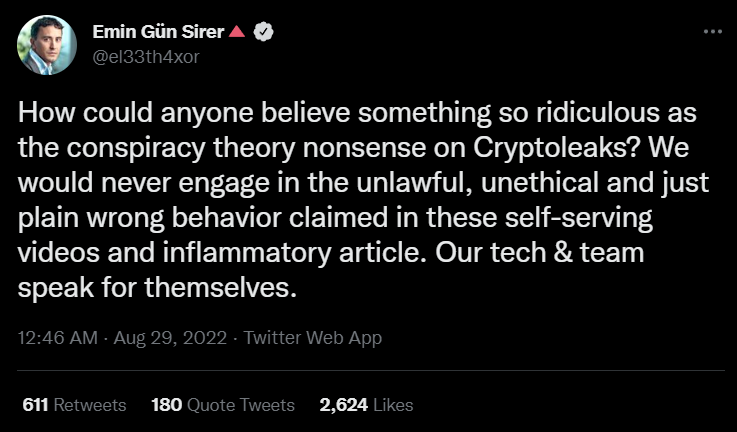 SponsoredОснователь Ava Labs Эмин Гюн Сирер возмутился обвинениями, назвав их «чепухой теории заговора». Он добавил: