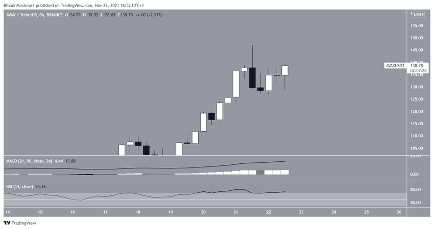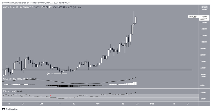 Бычий тренд AVAX набирает силу с 12 сентября. С 16 ноября цена растет параболически: за пять дней токен подорожал на 77%. И 21 ноября обновил исторический максимум на уровне $147.