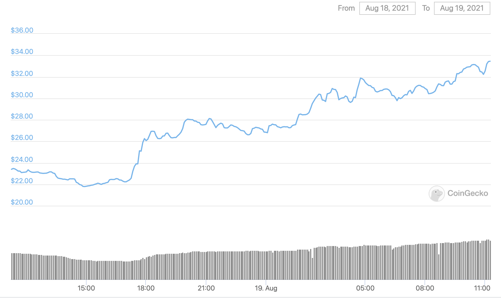 Нативный токен экосистемы Avalanche, AVAX, резко вырос. За сутки монета подорожала на 43% и на момент публикации AVAX торгуется по курсу $33,60. За месяц токен укрепился на 220%. Несмотря на впечатляющее ралли, она все равно еще на 45% ниже исторического максимума, достигнутого 10 февраля на уровне $59,40.