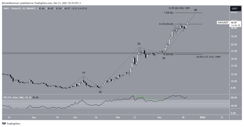 Дневной таймфрейм отражает бычий прогноз. Наиболее вероятный сценарий в рамках волнового анализа Эллиотта предполагает, что AVAX находится в пятой и последней волне восходящего движения, начатого в сентябре.