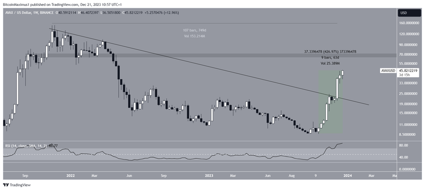 В процессе ралли AVAX прорвал 750-дневную нисходящую линию сопротивления, которая присутствовала на графике с момента достижения исторического максимума. Прорыв еще больше ускорил темпы роста.