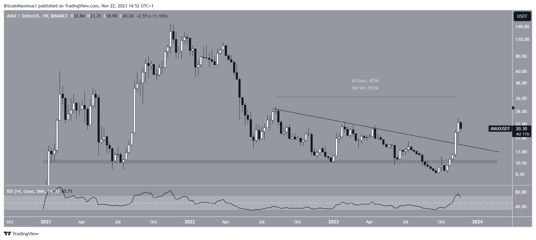 Нативный токен блокчейна Avalanche прорвался выше 455-дневной нисходящей линии сопротивления, но так и не смог закрепиться выше критической горизонтальной области.