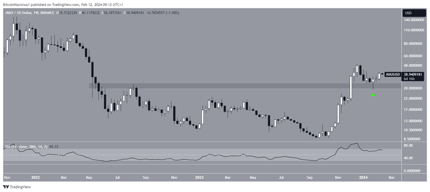Недельный таймфрейм показывает, что цена AVAX росла после отскока 22 января. Восходящее движение подтвердило критическую горизонтальную область в качестве поддержки. Ранее эта область с мая 2022 года играла роль сопротивления.