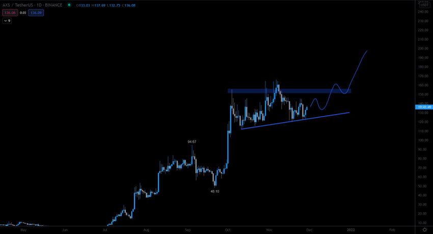 Axie Infinity (AXS), предположительно, завершает консолидацию и готовится к новой фазе роста. Прорыв текущего паттерна подтвердит этот сценарий