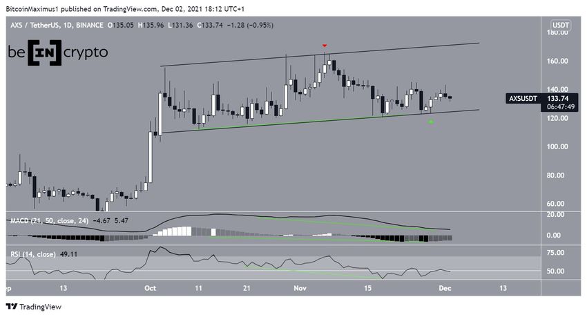 AXS торгуется в диапазоне $110 — $160 с 18 октября. Движение ограничено восходящим параллельным каналом. Токен оттолкнулся от его верхней границы 6 ноября (красный значок) и с тех пор снижался.