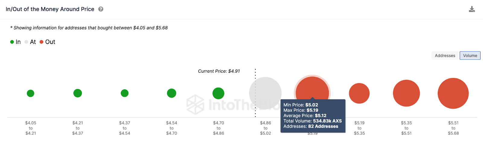 Данные In/Out of Money Around Price иллюстрируют распределение цен покупки текущих инвесторов в экосистеме Axie Infinity. Оно подтверждает, что цена AXS может отреагировать на покупательское давление китов отскоком в сторону $7. Однако на пути к этой отметке Axie придется преодолеть сопротивление из 82 адресов, которые приобрели 534 830 токенов по средней цене $5,12.
