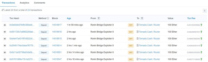 Адрес злоумышленника активизировался. По данным блокчейн-аналитика Колина Ву, известного в твиттере под ником Wu Blockchain, 1000 ETH с него ушло на другой кошелек, а 200 ETH было отправлено на миксер TornadoCash.